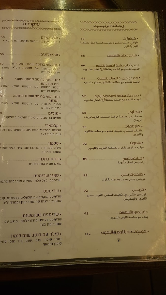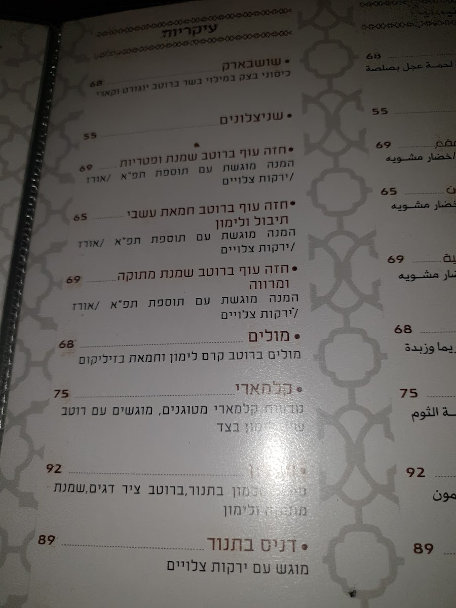Start your day with offerings like the ארוחת בוקר זוגית (couple’s breakfast), or enjoy lighter starters such as hummus paired with tender meat, and vibrant salads like טאבולה (tabbouleh) to accompany your meal. For those seeking heartier options, dishes like צלעות כבש (lamb ribs), סינטה עגל (veal sirloin), and פרגית (chicken thigh) bring rich, satisfying flavors to the table, fitting perfectly with the cozy yet spacious atmosphere of the restaurant.